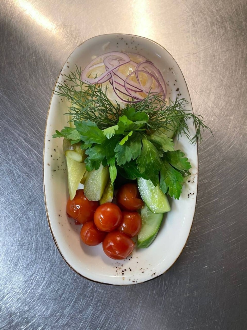 Хрустящие огурцы, сочные томаты и квашеная капуста с приятной кислинкой дополнены красным луком и зеленью