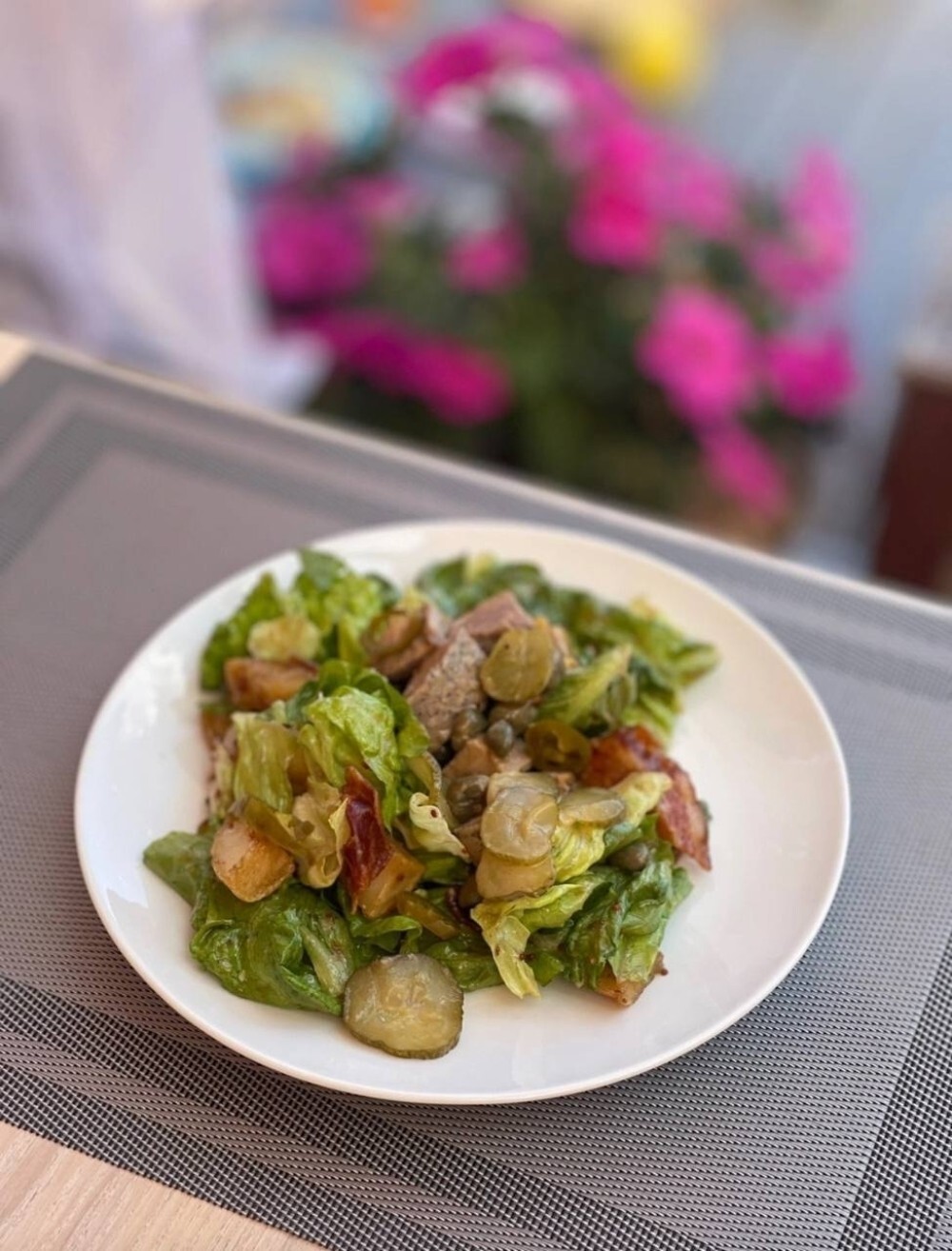 Застольный салат с бужениной и беконом: бекон, буженина, картофель, салат ромейн, каперсы, маринованные огурцы, а также перец халапеньо и медово-горчичная заправка