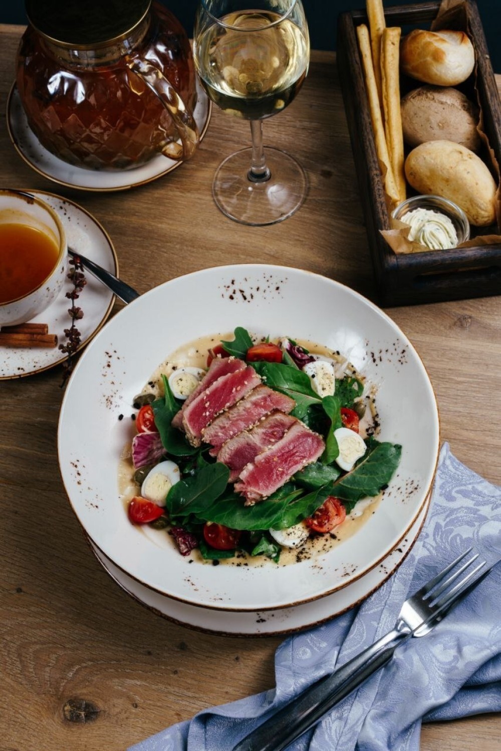 Охлаждённый тунец обжарки Medium Rare, со свежими овощами, листьями салата и соусом тонато