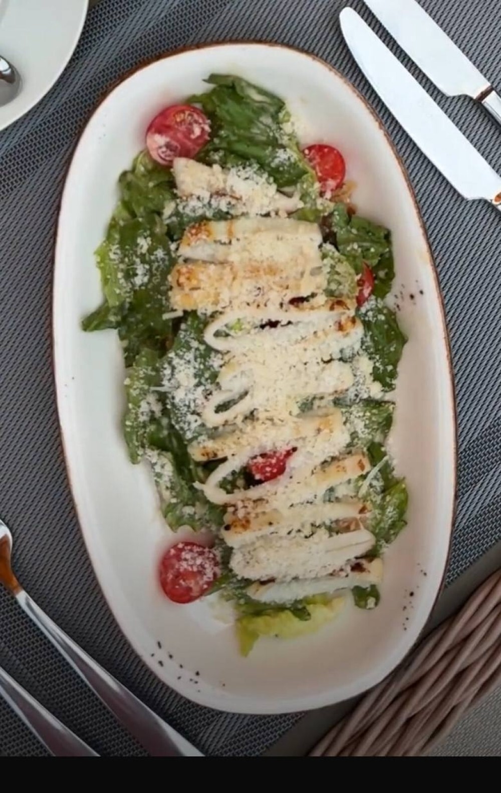 Салат из кальмара гриль, хрустящего бекона, сочных помидоров черри, салата ромейн и пармезана. Заправка прекрасно объединяет все ингредиенты