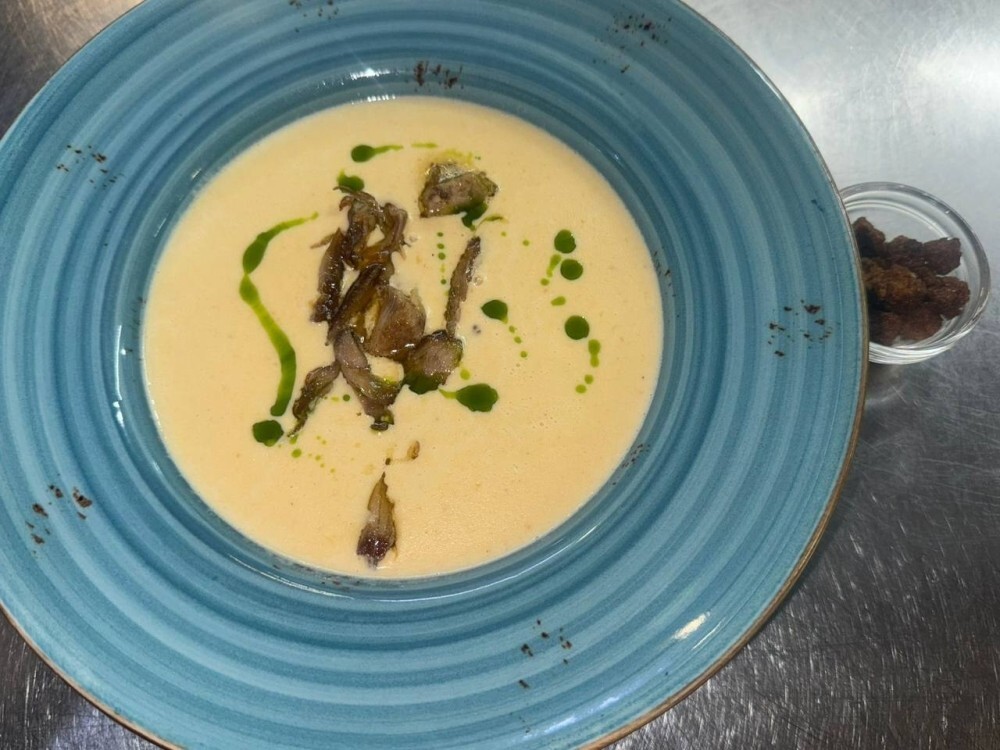Густой и ароматный крем-суп с нежной текстурой. В блюде чувствуется насыщенный вкус печёной моркови и обжаренного репчатого лука. Кусочки копченых свиных ребер