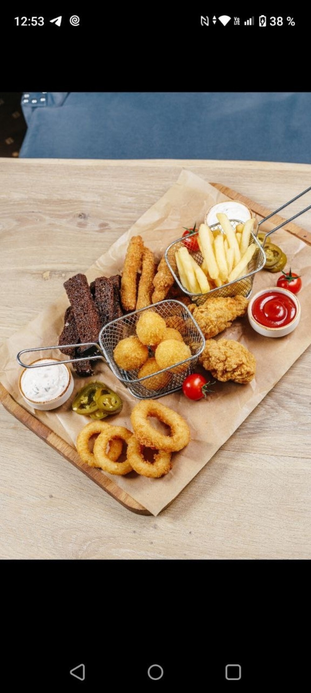 Сет закусок, который отлично сочетается с пивом. В него входят куриные крылья, свинина и курица в панировке, а также кольца кальмара. Также в наборе есть сырные и картофельные шарики, луковые кольца. Подается с чесночными гренками, халапеньо и соусами - чесночным, кетчупом и Тартар