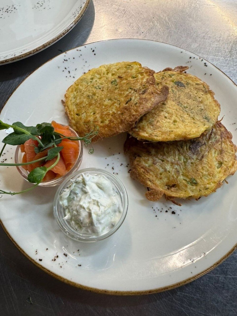 Горячие закуски Драники с лососем — это аппетитные драники из картофеля, дополненные нежным лососем слабой соли, которые идеально сочетаются с освежающим соусом дзадзики и ломтиком лимона