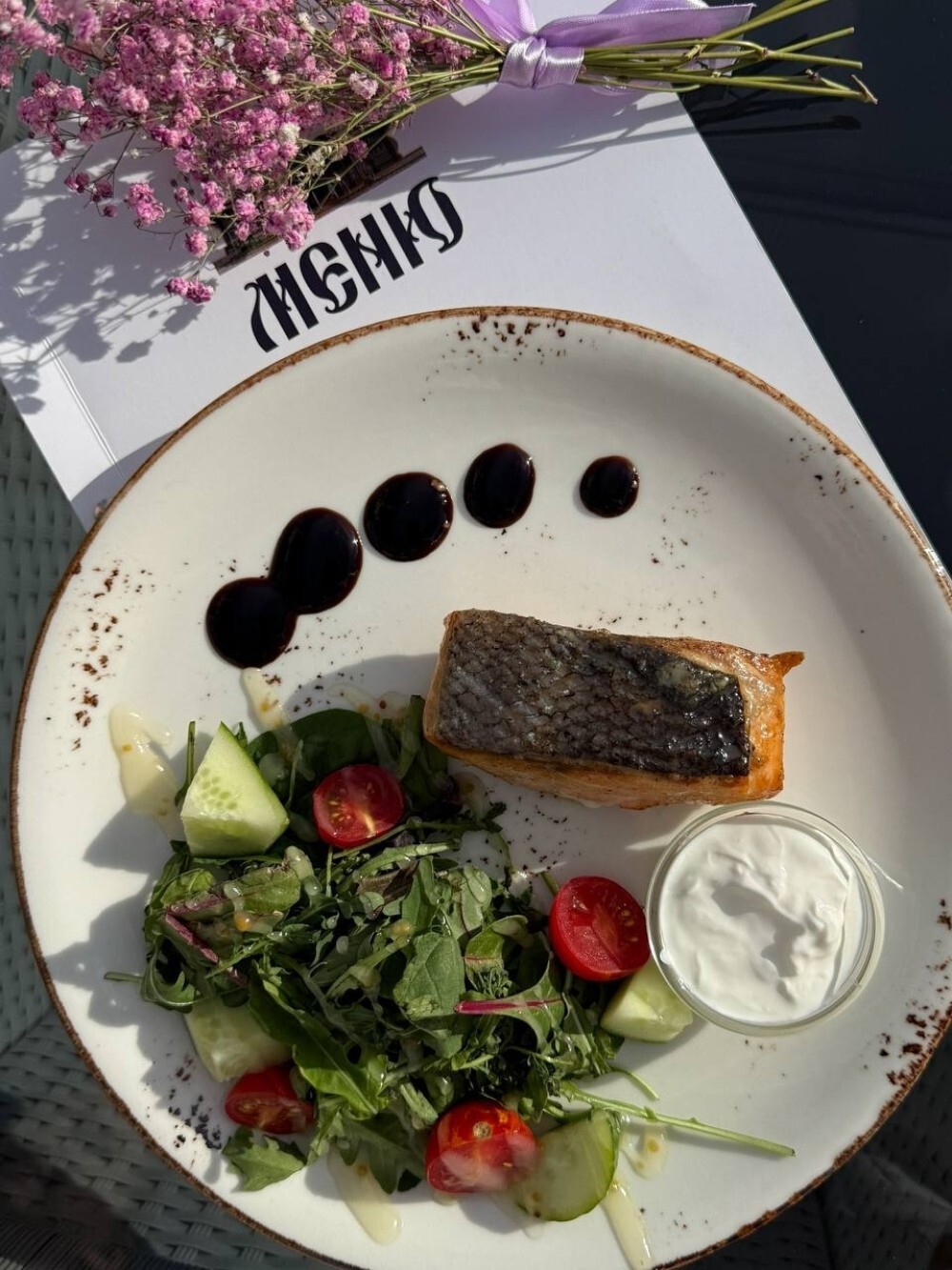 Нежный вкус сёмги гармонично сочетается с пикантным соусом из греческого йогурта и цедры лимона. В качестве свежего гарнира к горячему блюду добавили листья рукколы, помидоры черри и свежий огурец с соусом на основе мёда, оливкового масла и горчицы