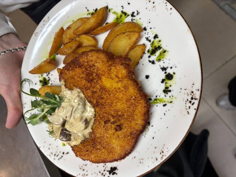 Шницель из свиного карбонада с жареным картофелем с грибами и соусом тартар