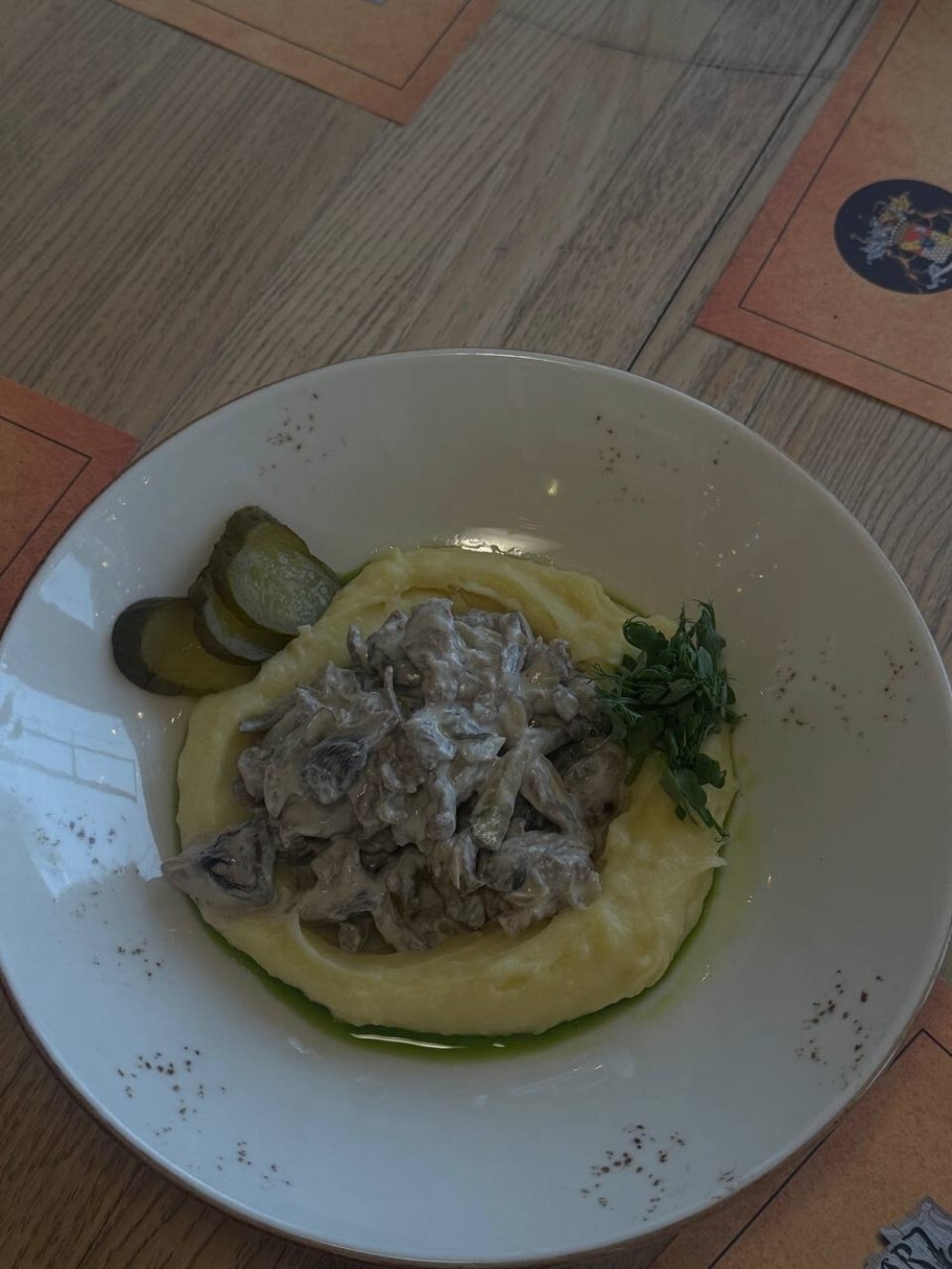 Нежная говяжья вырезка, ароматные шампиньоны и жареный лук в сливках, а также классическое картофельное пюре с маринованными огурчиками