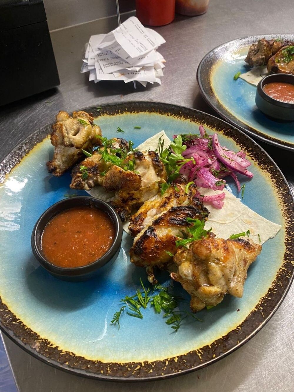 Сочные куриные крылья, замаринованные в специях, приобретают пикантный вкус. Подаются с домашней аджикой, маринованным красным луком, который добавляет свежесть и лёгкую кислинку