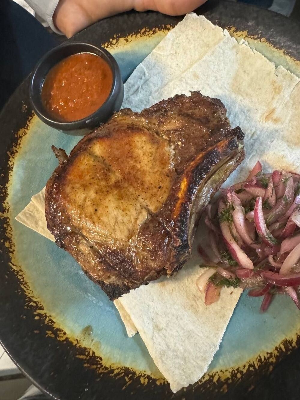 Сочное мясо свинины, на кости, приготовленое на гриле, душистый маринованный лук и пряная домашняя аджика - всё это отлично сочетается с нежным лавашом