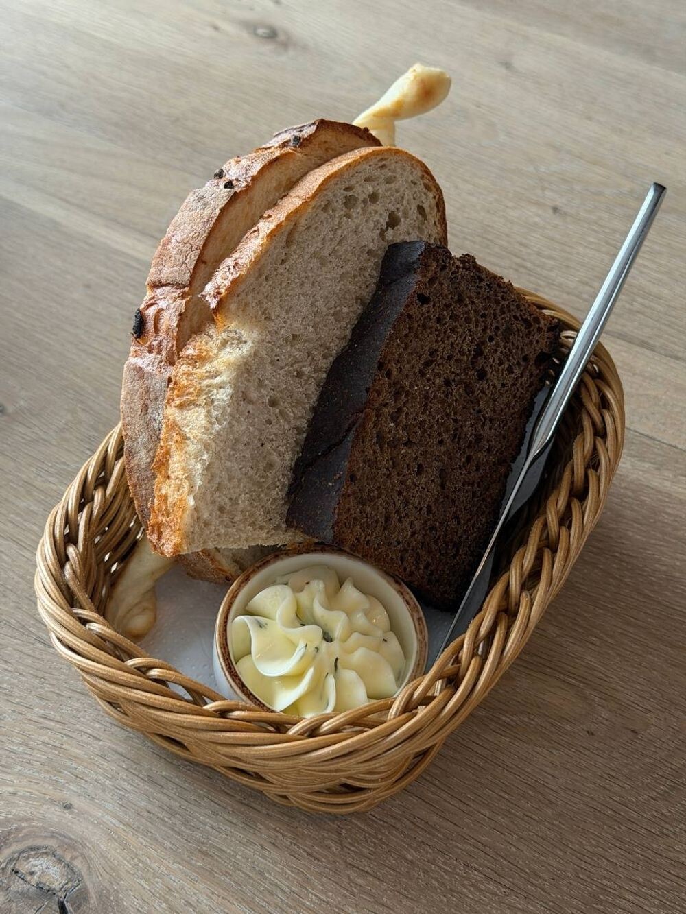 Хлеб трёх видов: русский с луком, бородинский с тмином, деревенский и гриссини с кунжутом— в сочетании сливочно-чесночного масла