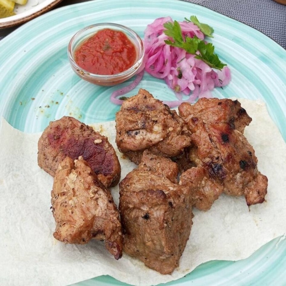 Сочное мясо, поджаренное на гриле, душистый маринованный лук и пряная домашняя аджика - всё это отлично сочетается с нежным лавашом.