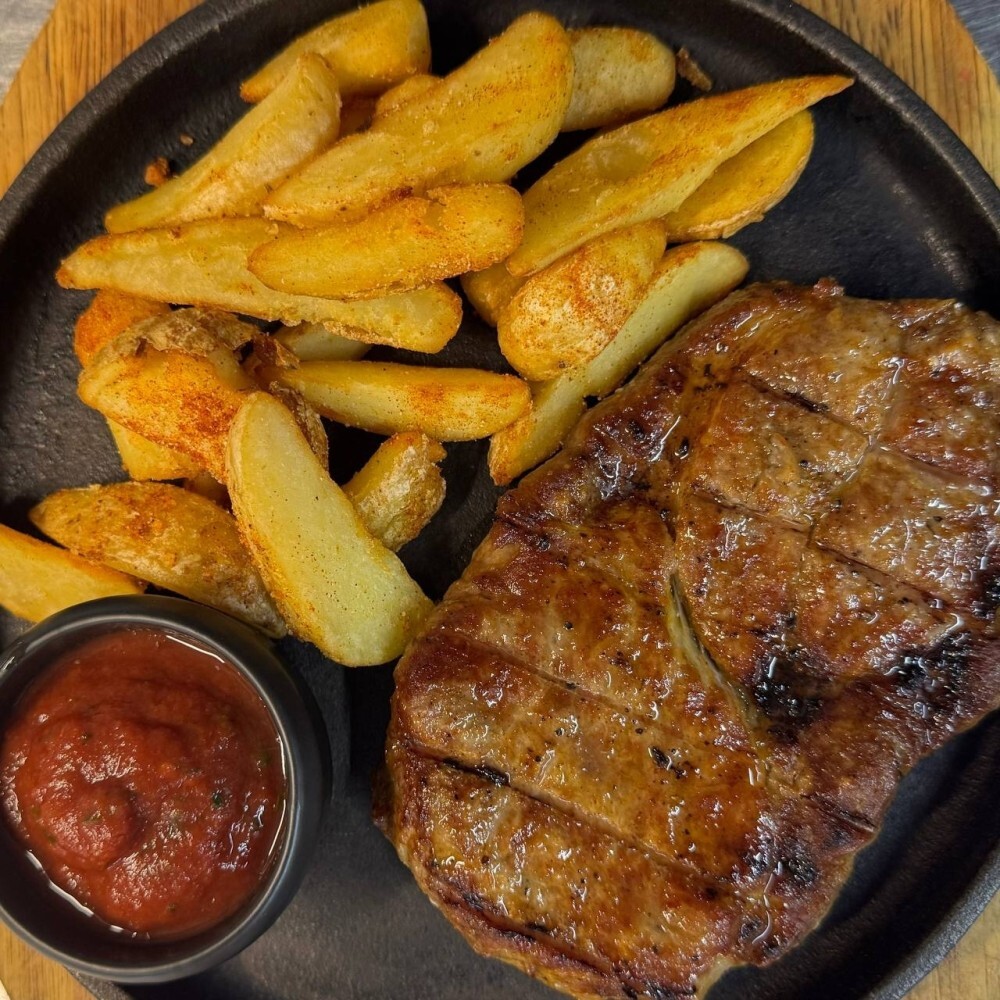 Сочный свиной стейк подаётся с румяным картофелем по-деревенски. Аджика домашнего приготовления добавит блюду пикантности.
