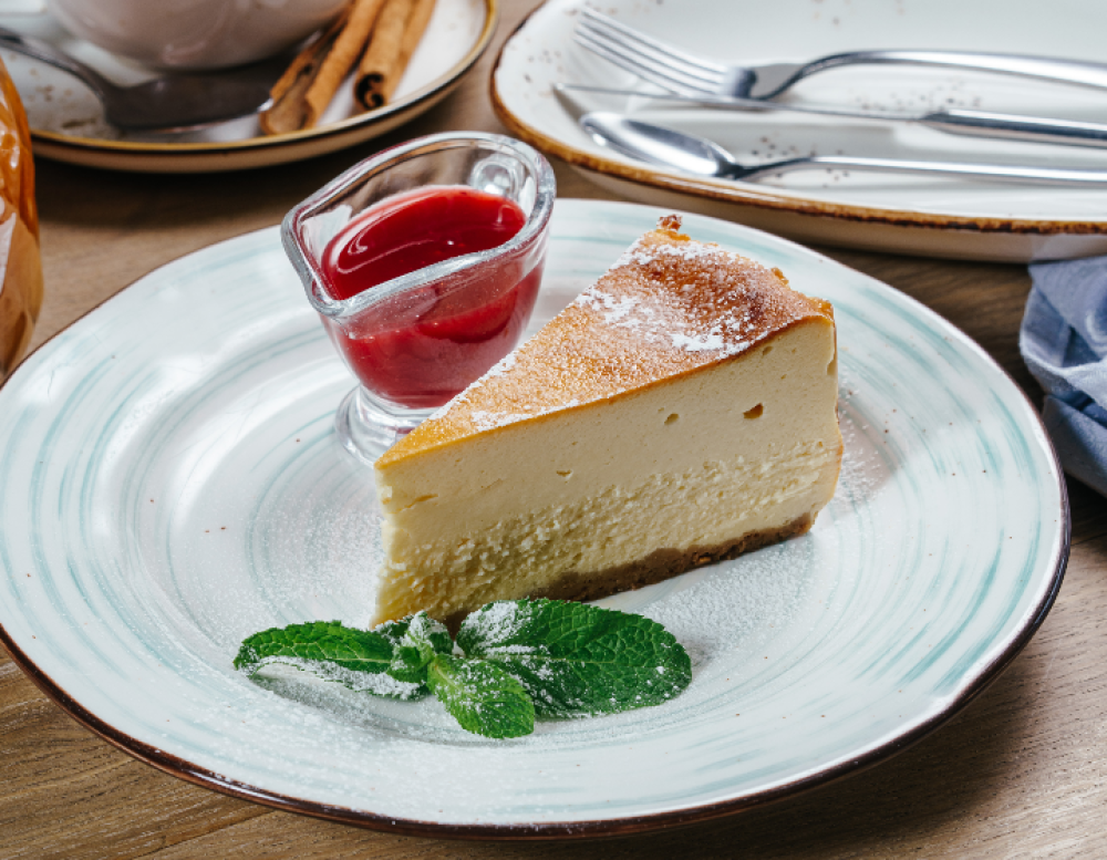 Воздушный, творожный чизкейк, с малиновым конфитюром.