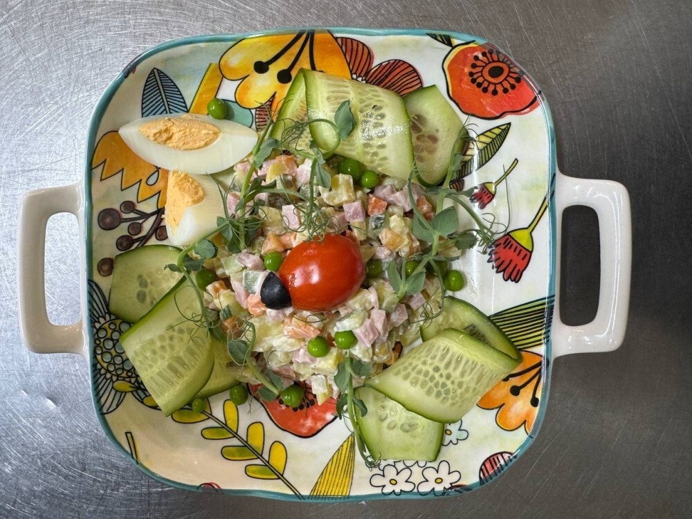 Он сочетает в себе мягкость отварных яиц и картофеля, а также свежесть огурца. Ветчина придаёт ему особую изюминку. Заправка из майонеза делает салат нежным и тающим во рту.