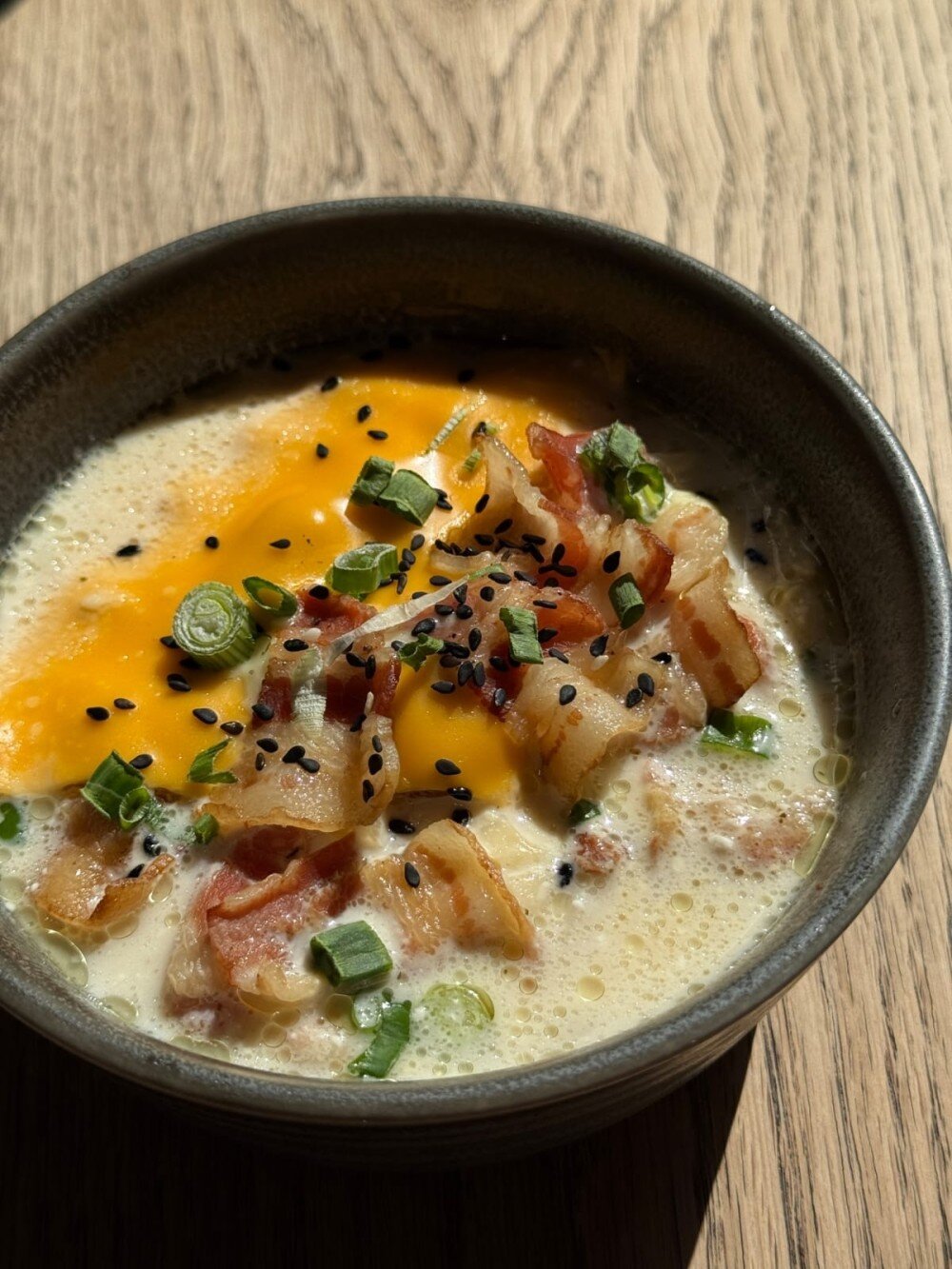 Нежный куриный бульон с кремовым сливочным сыром и лапшой удон создают идеальную основу. Подкопчённый бекон и ломтик чеддера придают блюду пикантную изюминку. Это идеальный суп для тех, кто любит сочетание традиций и экспериментов.