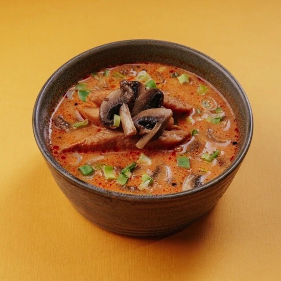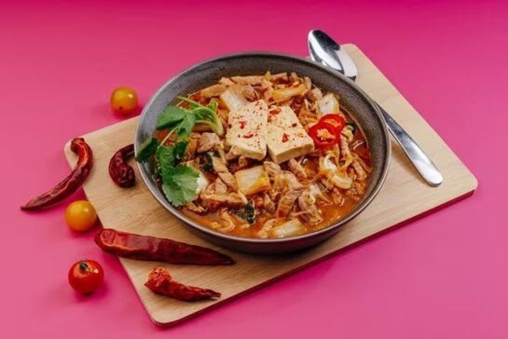Кимчи Тиге — мега острый суп с нежной свининой, квашеной капустой кимчи, луком и морковкой. Особая пикантность от томатной пасты, пасты кочхуджан и соуса шрирача. Завершает композицию нежный сыр тофу, придавая блюду легкость и сливочность. Идеально согреет и пробудит ваш аппетит!