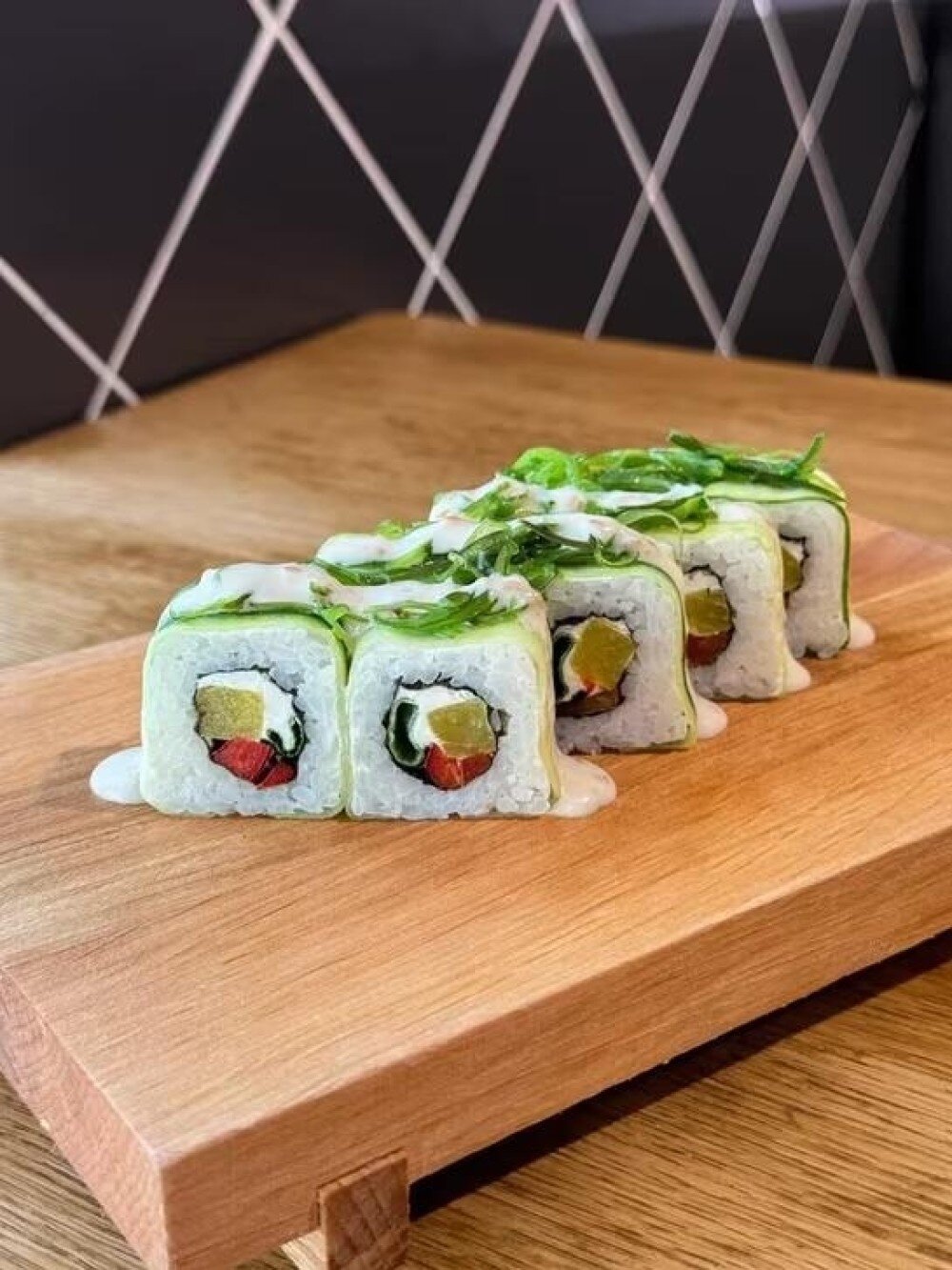 Попробуйте необычный вкус с нашим Веган роллом! Рис и нежный творожный сыр сочетаются с маринованной редькой дайкон и хрустящим болгарским перцем. Всё это аккуратно завернуто в свежие слайсы огурца и украшено Чукой с кунжутным соусом. Легко, вкусно и полезно — идеальный выбор для тех, кто ценит натуральные ингредиенты!