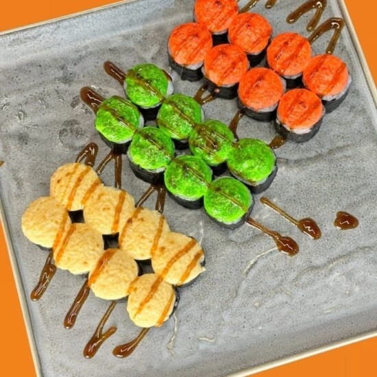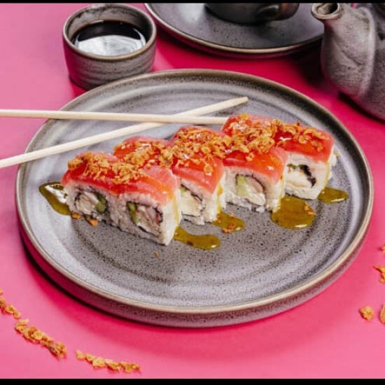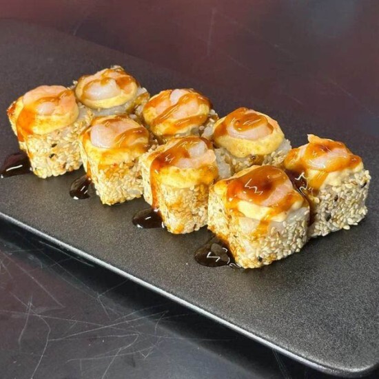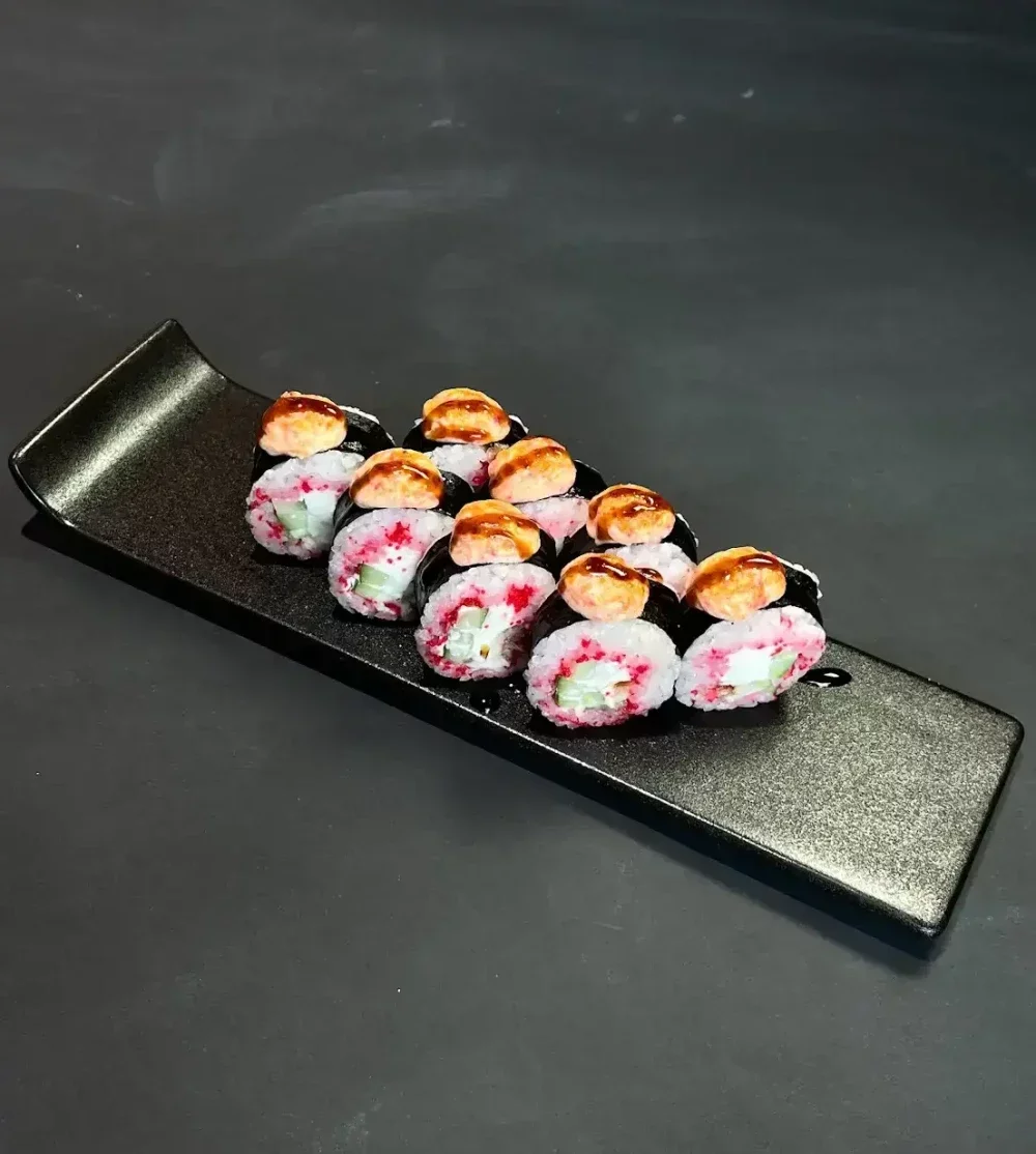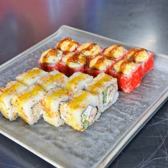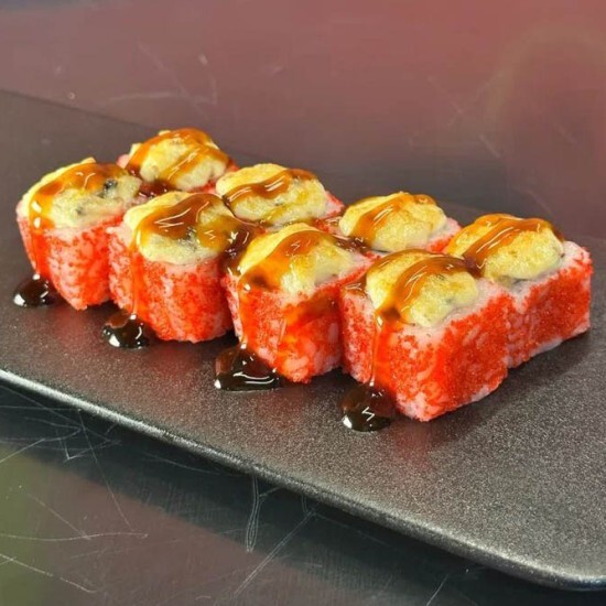 И Запечённый цветной ролл с нежным угрём и творожным сыром. Свежий огурец икра массаго добавляют текстуру и яркость. Вкусная запечённая шапочка из майонеза, твердого сыра, соуса шрирача и чесночной пасты раскрывает все грани аромата. Попробуйте настоящее гастрономическое наслаждение уже сегодня! ?